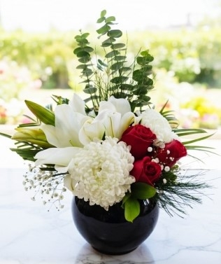 Bu görsel, şık bir siyah vazo içerisinde hazırlanmış karma bir çiçek aranjmanıdır. Aranjmanda kullanılan temel öğeler şunlardır: Beyaz Zambaklar (Lilium): Büyük, beyaz ve asil görünümlü çiçekler. Kırmızı Güller: Aranjmana renk ve romantik bir hava katan vurgu çiçekleri. Beyaz Krizantemler (Mums): Top şeklinde, yoğun taç yapraklı beyaz çiçekler. Okaliptüs ve Yeşillikler: Arka planda dik duran, aranjmana yükseklik ve tazelik katan yeşil dallar. Cipso (Gelin Nefesi): Aralardaki minik beyaz çiçekli dolgu bitkileri. Bu tür aranjmanlar genellikle masa üstü dekorasyonu, hediye veya özel gün kutlamaları için tercih edilir.